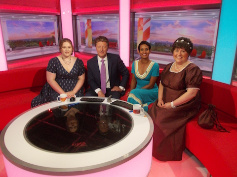 It was an absolutely surreal experience to arrive in the studios (not quite at the crack of dawn, but close enough), be treated to a session of professional styling and find ourselves on the very famous couch, talking to Charlie Stayt and Naga Munchetty about how Jane Austen and her world became a way of life for us.