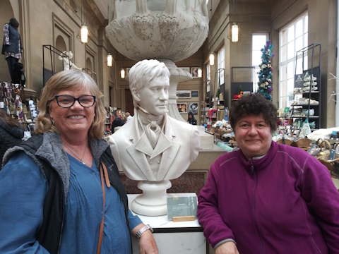 We had all sorts of plans for the rest of the day, like stopping in tranquil Steventon where Jane Austen’s earliest novels took shape, and then finish the day with a pyjama party and some Darcy champagne (yes, I had to stock up on that when I saw it in the shops!). But I simply couldn’t turn down the awesome opportunity of appearing on BBC Breakfast News on the following morning along with my friend Sophie Andrews, Austen blogger at Laughing with Lizzie, and Zack MacLeod Pinsent, the fascinating Regency tailor featured on My Friend Jane. So there we were, Sophie and I, hopping on a train to Manchester at incredibly short notice, so that we could be there, ready and waiting, on the following morning.