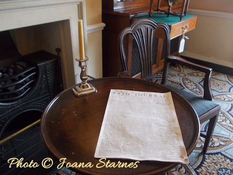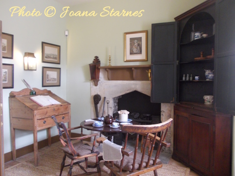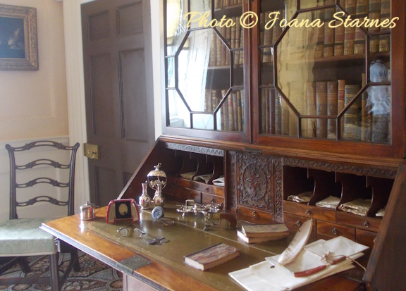 Across the entrance hall there is the morning parlour, with the table set up for an even more intimate breakfast, and beyond it there is a room where Mr Bennet might have sat to read the paper in peace and quiet whenever he came to visit his favourite daughter – usually unannounced 🙂 . And alongside there is a writing desk that Mr Darcy might have vacated, for Mr Bennet to write home. Not that Mr Bennet would trouble himself to do so. But he must have used it, because this is where he left his spectacles.