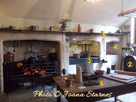 Even if the family did not belong in the highest circles and did not entertain lavishly, cooking for the Georgians was no mean feat. In most houses, grand or humble, cooking was still done over an open hearth, as had been the case for centuries. Pots, kettles and griddle pans were suspended over the fire from wrought iron cranes that allowed them to be raised, lowered, or swung out. The meat was roasted on spits worked by a mechanical device – (1) in the image below – or by a smoke-jack in the chimney (a vane turned by the upward current of hot air and smoke). A hastener (2) might be used, so that the joint would be exposed to heat on all sides.